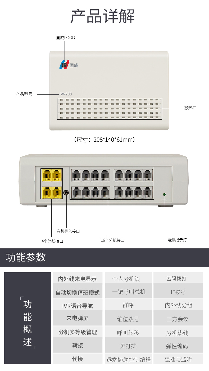 桌面式语音通信设备,采用先进的双CPU多处理器、分散式管理构架方案技术,外线支持4条,支持16内线分机、1个3.5mm语音接口。