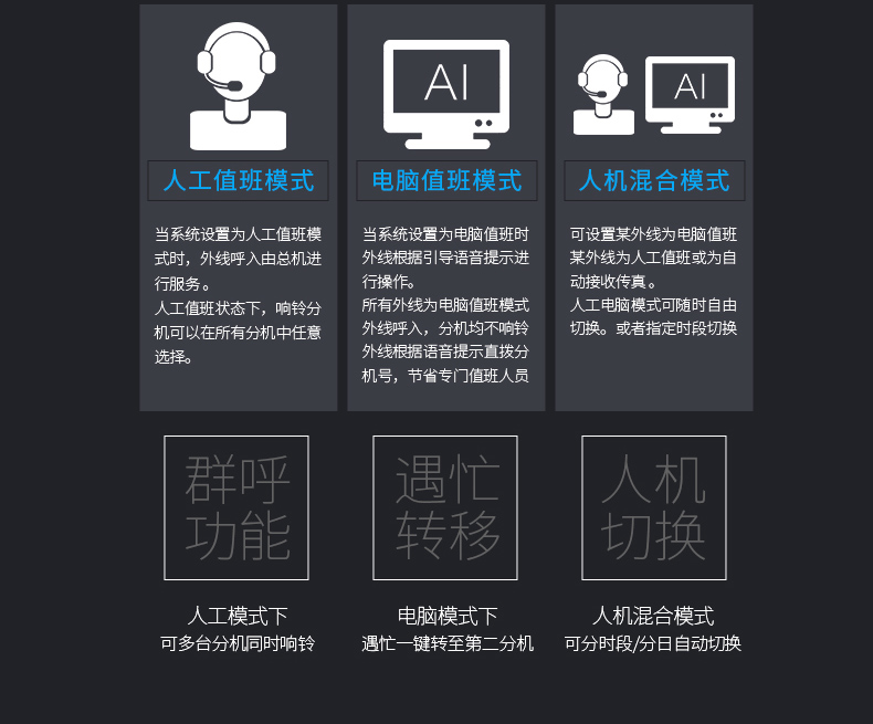 当系统设置为电脑值班模式时,外线根据语音引导进行操作;当系统设置为人工值班模式,外线由总机进行服务。