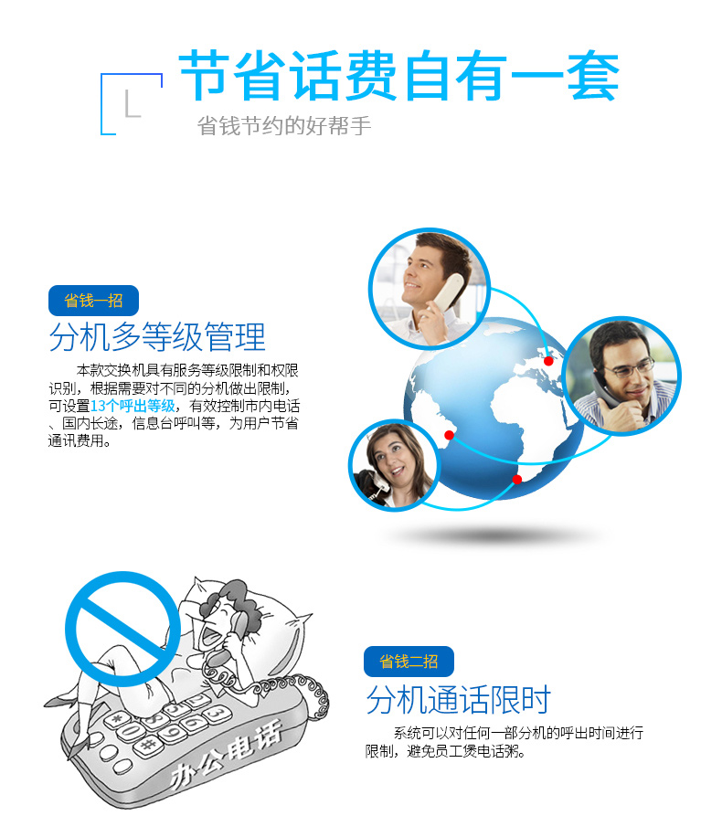 系统具有服务等级限制和权限识别。根据需要对不同的分机做出限制,可设置13个呼出等级,有效控制了市内电话、国内长途、信息台呼叫等,为用户节省通讯费用。
