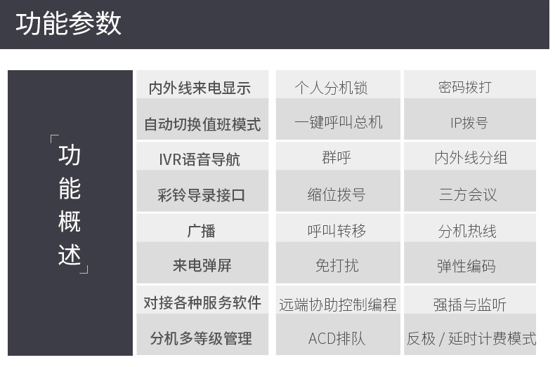 5:语音业务包含:PC话务台、2路电脑话务员、IVR语音导航、来电弹屏、专用话机功能、二次来显、广播功能、呼叫保留、外接音乐、对接酒店管理软件、叫醒服务、反极/延时计费模式、押金管理、自由选择中继、自由更改转换等待音乐、系统功能列表、内外线来电显示、人工/电脑值班、自动切换值班模式、彩铃导录、录音时间、自报分机号码、分机一键呼叫总机、分机热线、分机密码、分机弹性编码、代接/代拨电话、遇忙/移位/无条件转移秘书转移、三方会议、通话限时、强插、监听、免打扰、ACD排队、远端协助控制编程、HCI人机互换、内外线分组、内线预约、内线状态重拨、外线多种出局方式、群呼、缩位拨号、经济路由、大容量话单存贮器、话单转发、去电属地查询、多次转接无应答回铃、任意开通外线、三级防雷等功能。