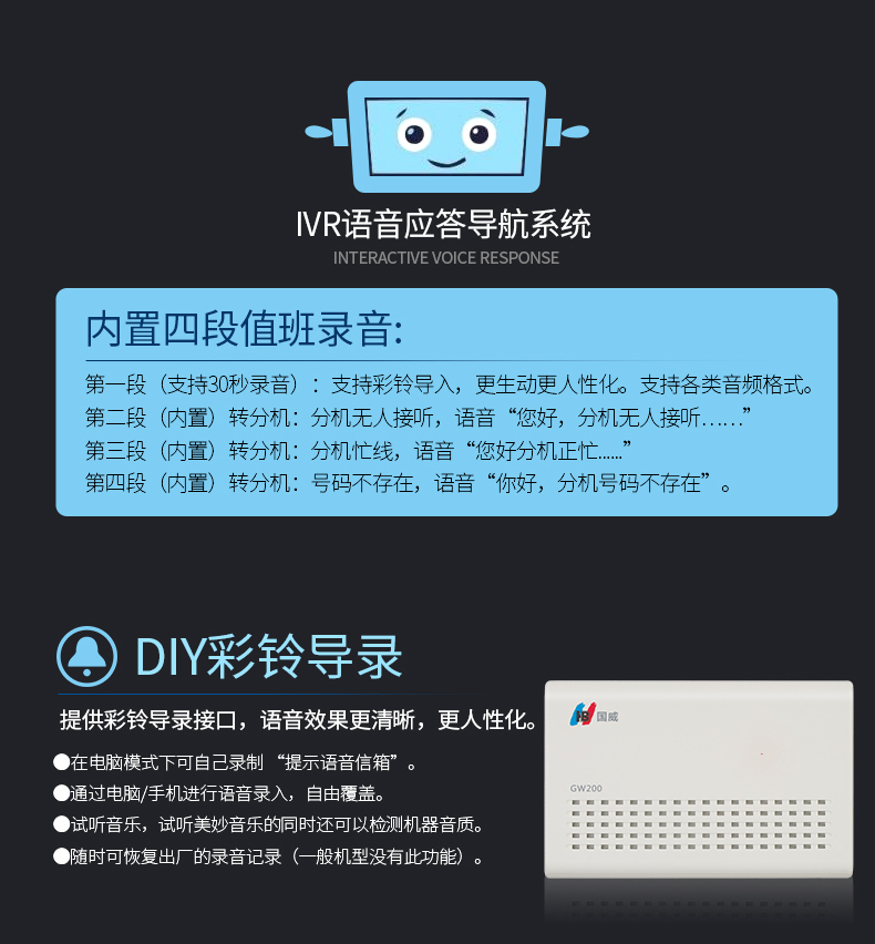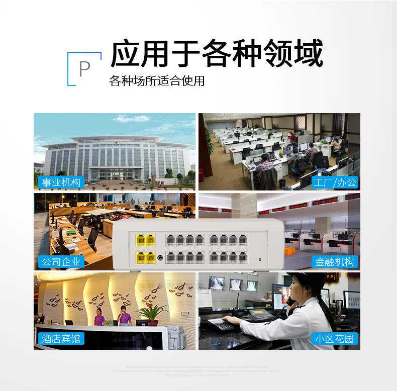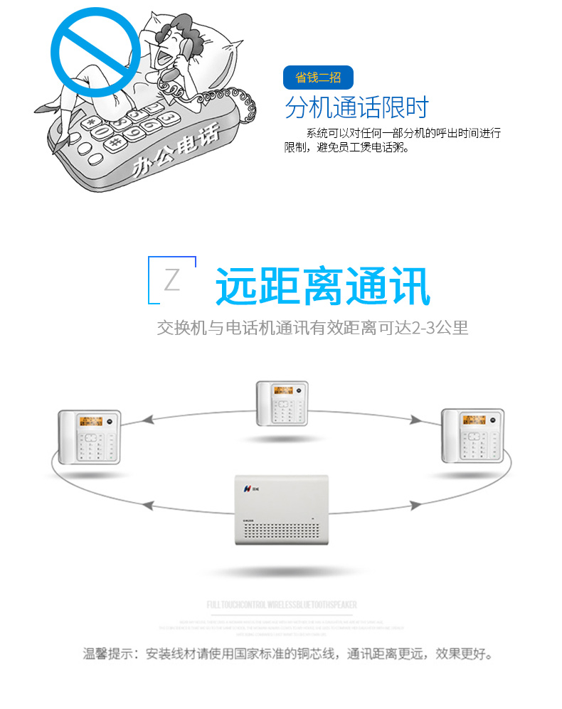 桌面式语音通信设备,采用先进的双CPU多处理器、分散式管理构架方案技术,外线支持4条,支持16内线分机、1个3.5mm语音接口。