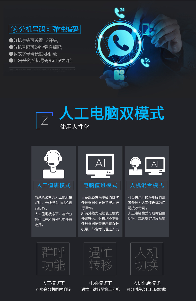支持DOD2+BID呼叫、内部分机挂机、中继立即释放的接续、复原的多方控制系统,确保系统稳定运行。
