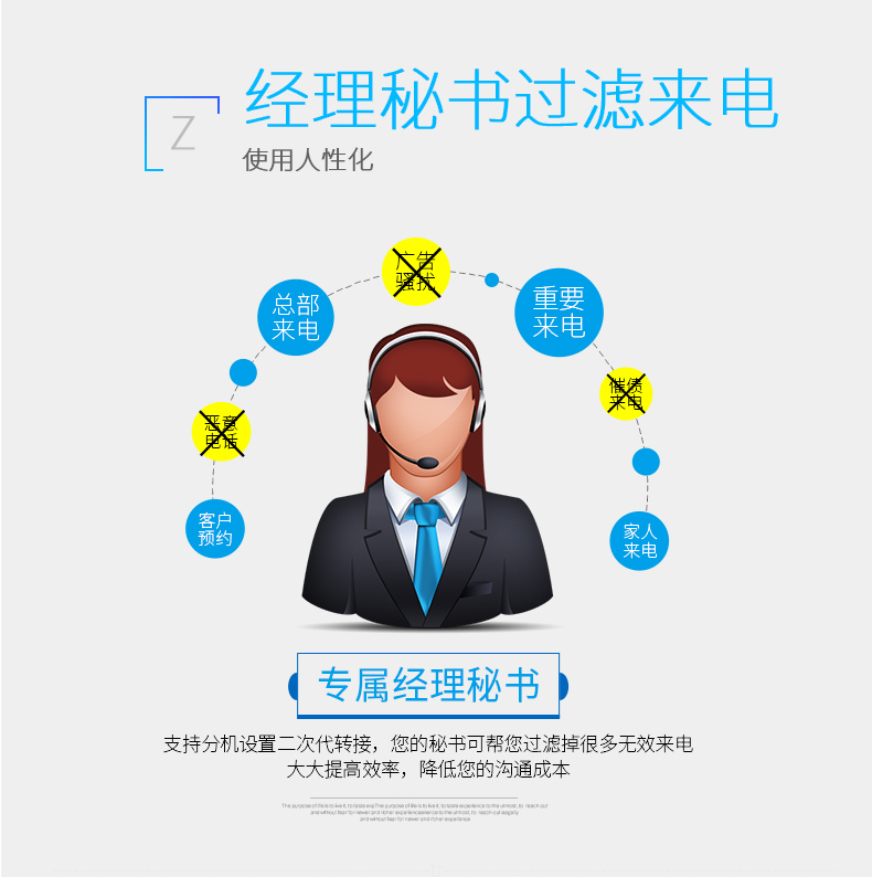 语音业务包含:电脑话务员、二次来显、2-4位不等号分机并存、语音报号、外线专用、弹性编码、分机分组、分机热线、呼叫转移、代接、强插、监听、三方通话、缩位拨号、断电记忆、断电逃生口可用、随身密码、分区振铃、IP拨号等。