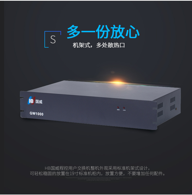 ▲1:铁壳标准机架式语音通信设备:支持8外线48分机、8个用户模块槽位、具备广播、音乐、LAN、RS232接口、设备CID运行状态灯、内外线颜色识别分组、设备可调整挂耳自由前后灵活安装在机柜。
