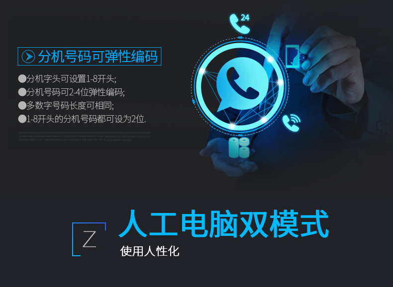 所有分机号码都可以在1-9之间任意编排,不受任何数字限制,不同字头,不同长度的号码可以同时并存,更适应与酒店或者电话号码要求与房间号码一直的环境。