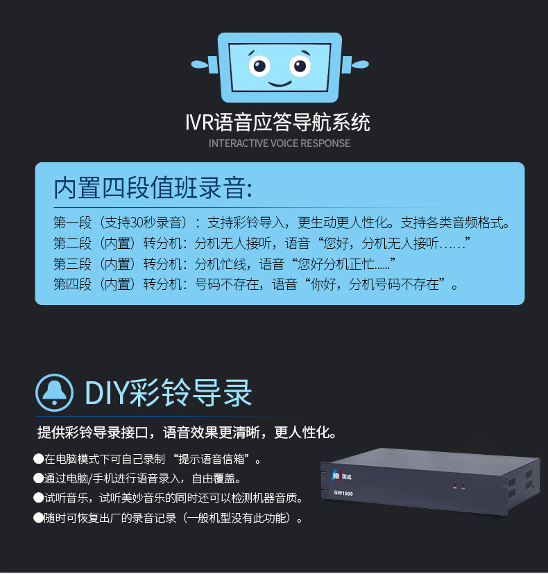 在查询物理号码、分机号码、登陆系统密码,操作功能设置等都会以语音方式报出。