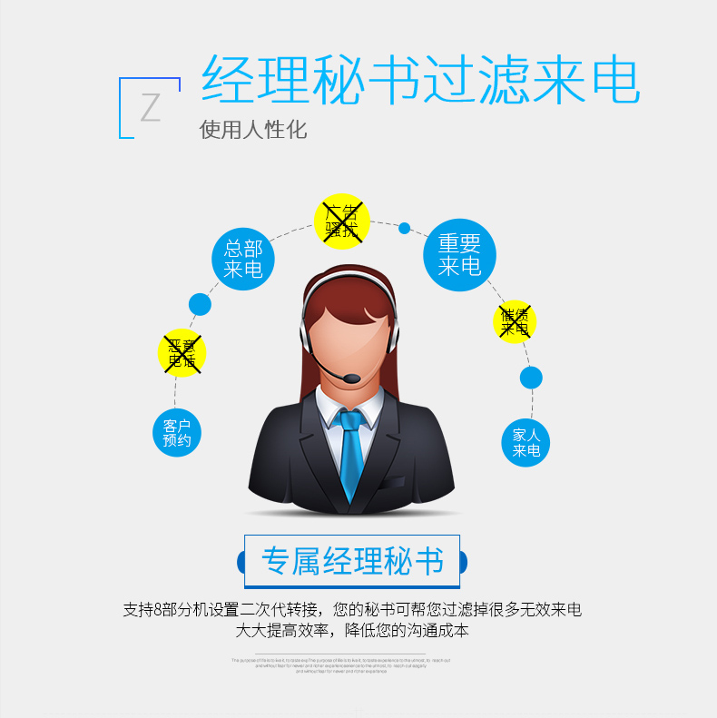 呼叫领导的电话经过秘书转接,征求领导意见后再决定是否转接。此功能不影响领导使用电话呼出外线。
