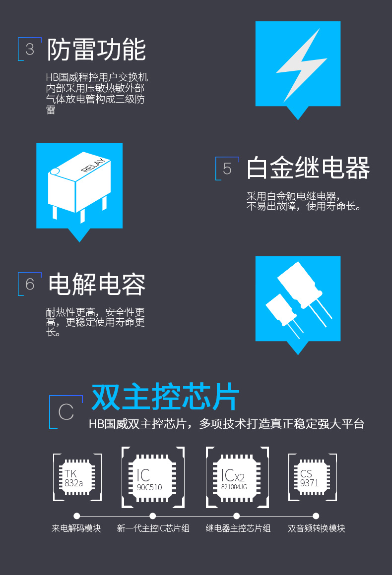 5:语音业务包含:PC话务台、2路电脑话务员、IVR语音导航、来电弹屏、专用话机功能、二次来显、广播功能、呼叫保留、外接音乐、对接酒店管理软件、叫醒服务、反极/延时计费模式、押金管理、自由选择中继、自由更改转换等待音乐、系统功能列表、内外线来电显示、人工/电脑值班、自动切换值班模式、彩铃导录、录音时间、自报分机号码、分机一键呼叫总机、分机热线、分机密码、分机弹性编码、代接/代拨电话、遇忙/移位/无条件转移秘书转移、三方会议、通话限时、强插、监听、免打扰、ACD排队、远端协助控制编程、HCI人机互换、内外线分组、内线预约、内线状态重拨、外线多种出局方式、群呼、缩位拨号、经济路由、大容量话单存贮器、话单转发、去电属地查询、多次转接无应答回铃、任意开通外线、三级防雷等功能。